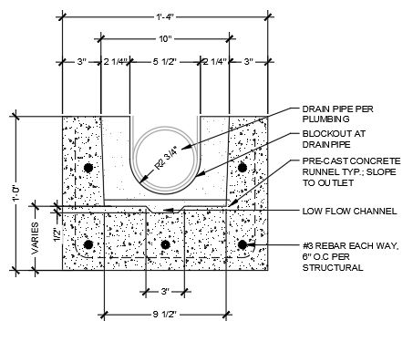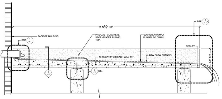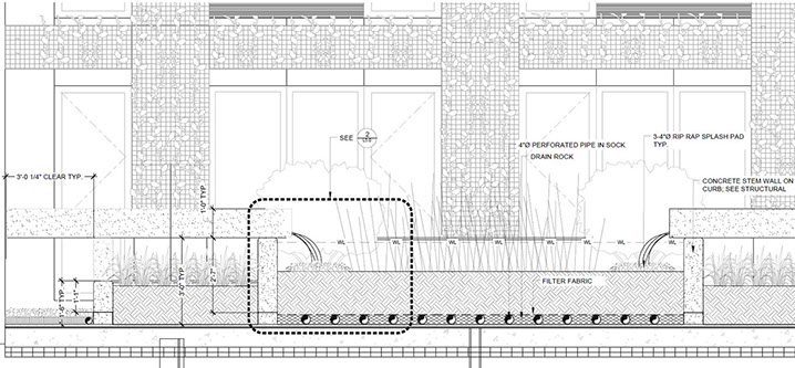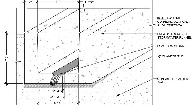 All of the plantings, in accordance with LEED standards, are 100% native. The stormwater planter is serviced by two custom runnels, each spanning low planter walls and spilling gracefully into a bed of decorative rock. The plantings are attractive, yet functional species which treat the runoff from the roof of the building.