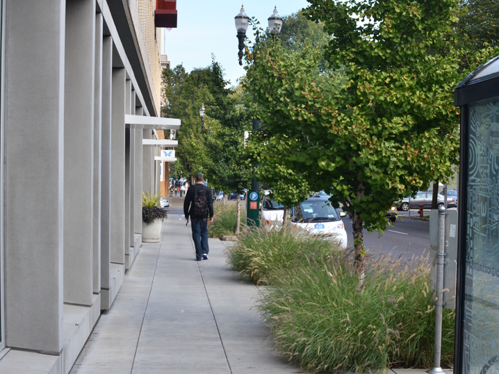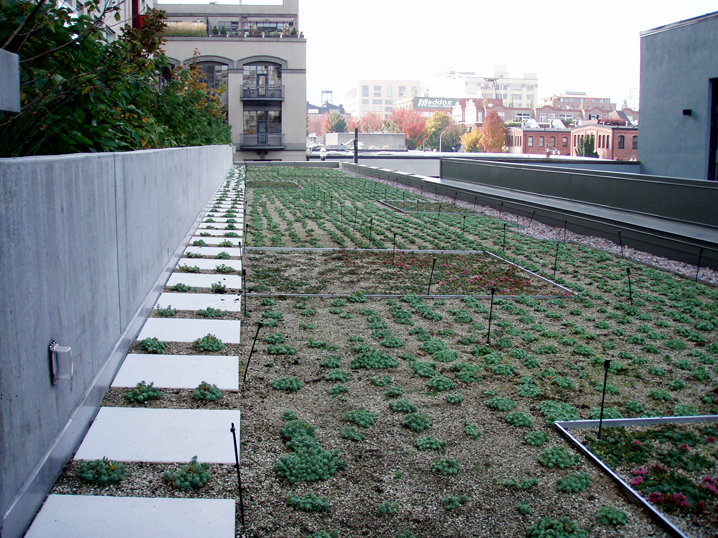 Creating a model of sustainability for urban architecture is at the heart of the 937 Glisan project. KLA worked designed a 4,000 sf podium green roof featuring a 150 foot long stormwater flow-through planter that divides private podium level terraces from the adjacent extensive eco-roofs. The stormwater is conveyed from the tower roof through conventional internal downspouts and spill into custom precast concrete runnels that extend from the building face atop partitions between private terraces and cascades into the planter. The water flows and is slowly cleansed as it infiltrates a special growing medium that hosts native plants.