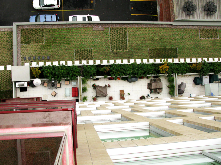 The extensive ecoroof planting design conceptually mirrors the solids and voids of the building façade’s panels. Contrasting blocks of plant material give residents an interesting “green” view of the building’s podium level from above. Finding varying colors and textures of sedum and native plants that thrive in the shadow of the tower and in wet/dry conditions was challenging.