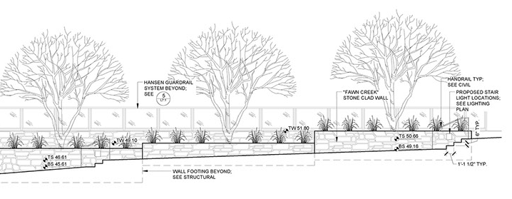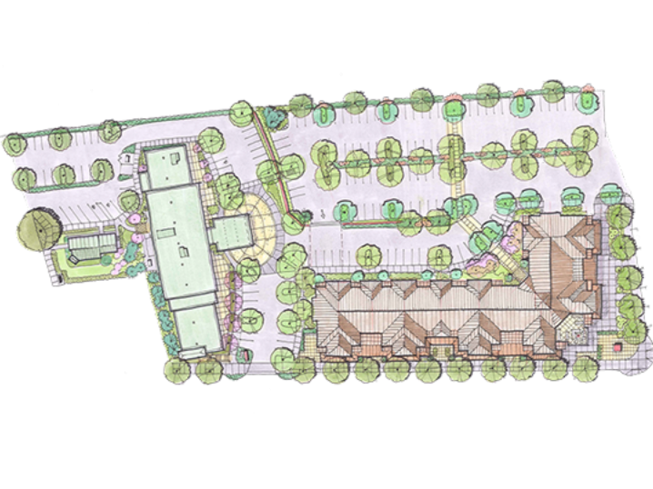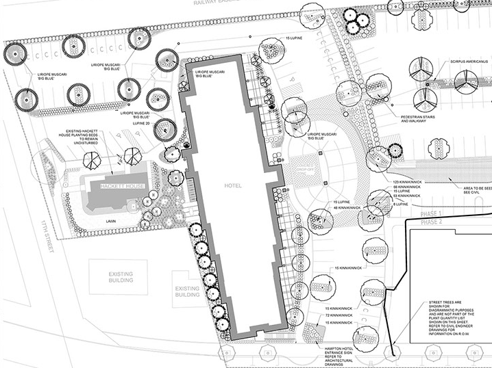 Phase 1 of the project, featuring new plantings around the historic Hackett House and a new Hampton Inn and Suites, is in the Construction Document stage and is due to begin work in late 2017. Phase 2, which will provide retail spaces and multi-family housing, is in its early design phases.