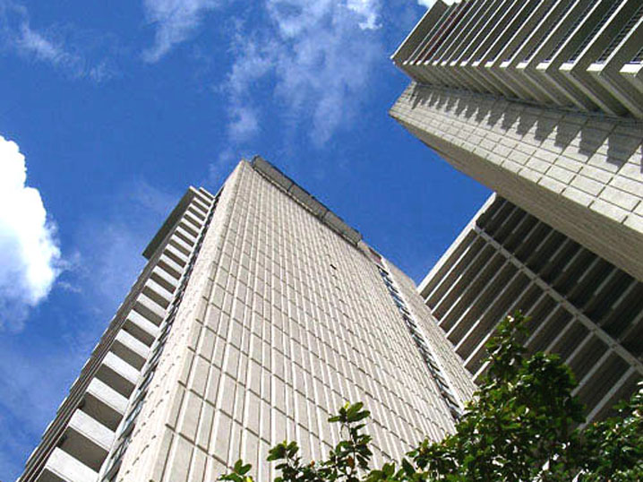 The three towers that surround the American Plaza were designed by Travers/Johnson Architects and built over a 15 year period beginning in 1970. The plaza itself is a public open space which revolves around a large scale corten sculpture by the noted local sculptors Lee Kelly and Bonnie Bronson. This space is the terminus of the pedestrian promenade that links the development with the landmark work of landscape legend Lawrence Halprin to the north.