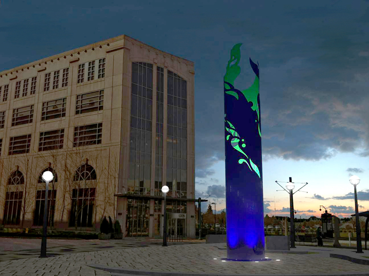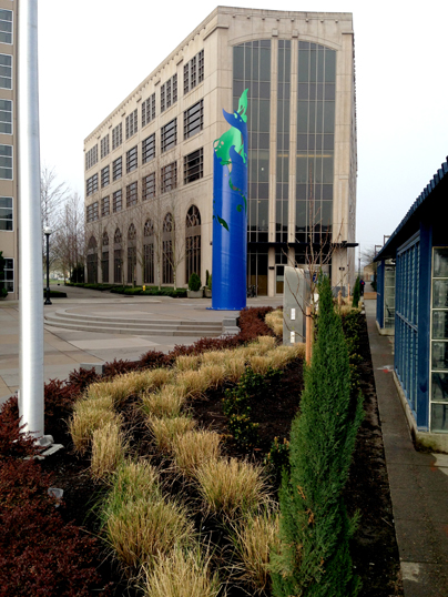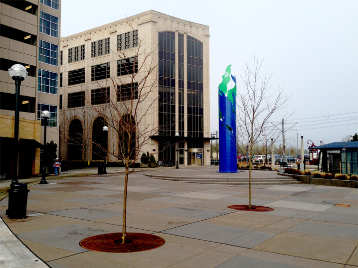 Slated to open in April of 2014 the South Plaza at the Beaverton Round signals the completion of a new phase of rejuvenation for this important urban Redevelopment Area. The South Plaza will be the new foyer to the City of Beaverton’s relocated City Hall. KLA worked closely with the City to design the space for a diversity of uses. The concept revolves around the nexus of three historic creeks referenced in the design with curvilinear geometry on the northern half of the plaza also used to define three major spaces on the south side. Each of these spaces serves a different purpose but fits into a cohesive vision for the plaza. Inscribed granite bands carry the names of Beaverton’s Sister Cities in the paving. This space is open and flexible and can accommodate a range of activities from small concerts to a farmers market. An arc of seat steps wraps the plaza the central sculpture by noted artist Devin Fields. A grove of trees provide a resting and relaxing environment complete with movable tables and chairs creating a urban park atmosphere. All of these amenities are within the reach of existing City Hall and Trimet creating a regional destination for years to come.