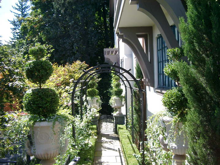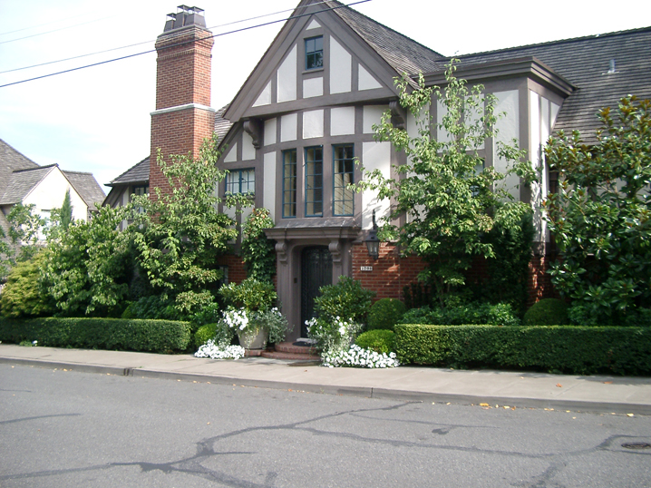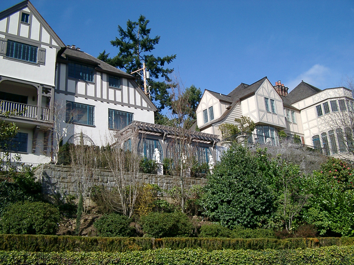 Resting above the City of Portland, complete with breathtaking views to the Cascade Range are two side by side Tudor style homes of landmark status. Restored by the same owner, the homes are used as a main residence and guest suites. The owners sought to enhance the European feel of each home with period landscape style alterations.