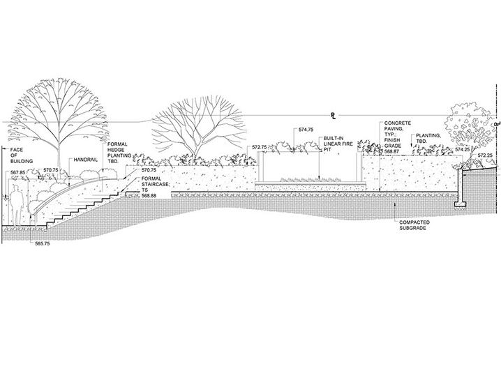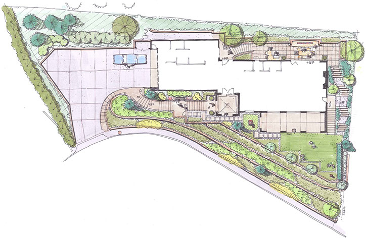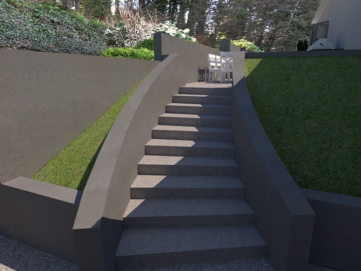 Repaired and reconstructed retaining walls will give the garden vertical structure while formal plantings will soften edges and provide an ribbons of color to the long horizontal lines running across the site. An enlarged back patio will entertain year round, with a custom fire bench and outdoor kitchen. An elegant new entry stair will welcome guests and provide an excellent opportunity to catch a glimpse of the towers and spires of Portland's ever-growing downtown in the distance.