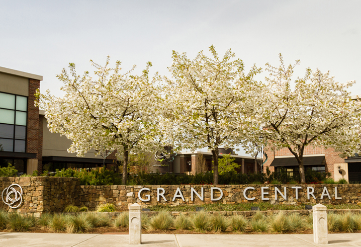 The central plaza features kinetic wind sculptures by Lyman Whitaker which provides a central attraction throughout all seasons. As a community gathering space, people at Grand Central dine alfresco and shop in leisure in a pedestrian friendly environment .