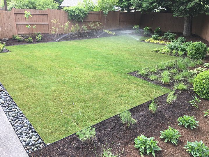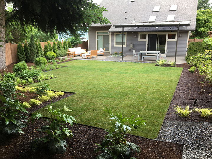 The backyard also has a unique plant palette, but is protected from the harsh winter winds by large existing Fir trees which were preserved on-site. The existing patio terrace was reshaped and enlarged, while access paths to the front and back of the site were also added. The lawn in the front and backyards were replaced with new sod and are bounded by river rock bands and new plantings.