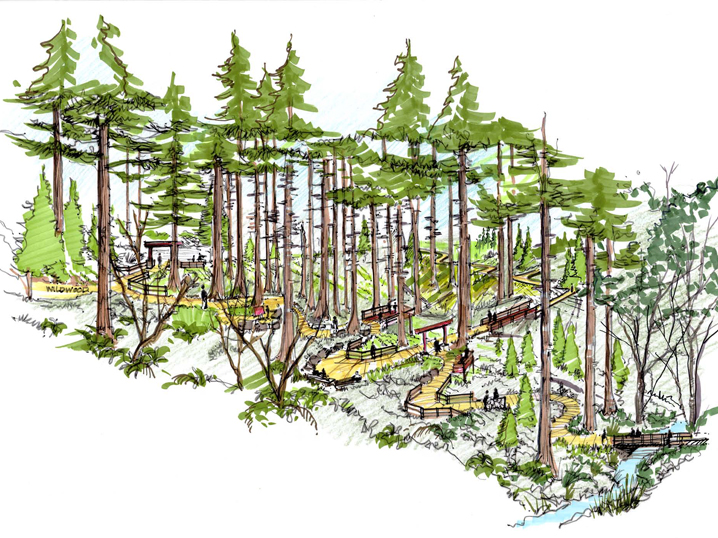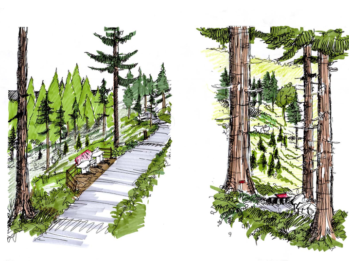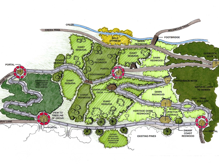 The Hoyt Arboretum has one of the largest and oldest collections of Giant Sequoia and Coast Redwood trees in the Pacific Northwest. Degraded trail conditions were prohibiting visitors from experiencing this rare treasure. Koch Landscape Architecture teamed with Ceccacci Associates to analyze the access trail system throughout the entire vicinity and make recommendations for phased improvements. Today, the arboretum boasts a much improved trail width, ADA surface, overlook deck and interpretive displays that will make this a more distinctive destination for visitors. The Hoyt Arboretum Sequoia Grove Deck employs low-impact and sustainable construction techniques including the use of recycled timbers, pin-pile support posts, pervious unit pavers and a limited amount of cast-in-place concrete.