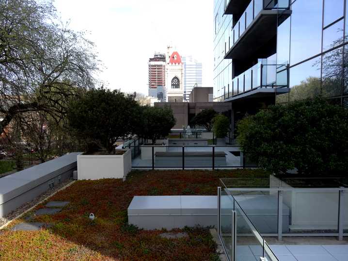 Sustainablity was paramount to the client, KLA and the architects. The 24 floor glass and stone building includes 4 floors of extensive eco-roofs and the central courtyard intensive eco-roof at street level. KLA’s landscape design of these spaces was pivotal to Ladd Tower’s LEED Gold certification.