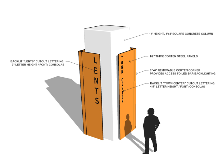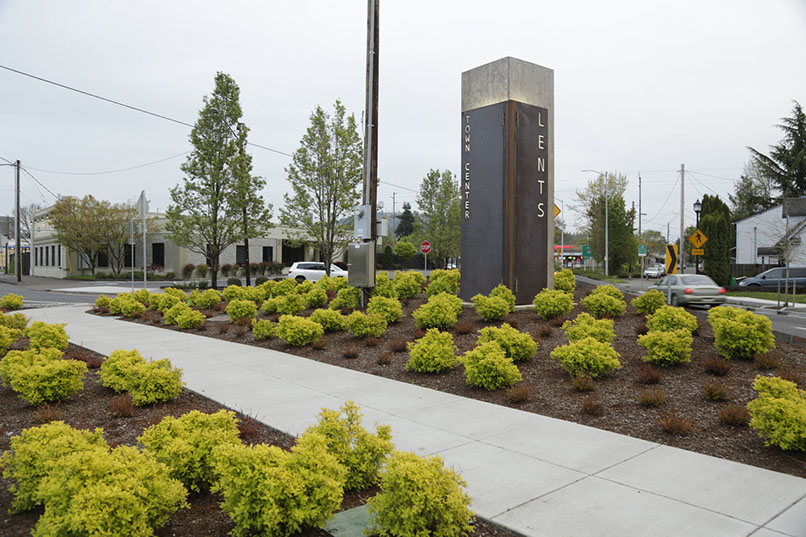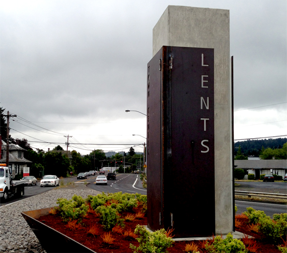 KLA lead the design charge for the most distinguishing feature of the street improvement plan; the Lents Town Center Entryways / Monuments Project. The design for the Entryways includes a lighted district-identifying landmark monument, pedestrian crossing improvements and striated bands of plantings retained by tapering corten “chevron” retaining walls. Breathtakingly beautiful day or night, rain or shine, the Lents Landmark sets itself apart from all other projects like it.