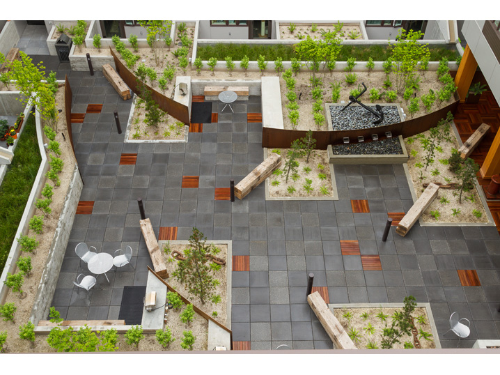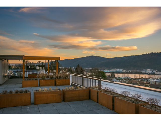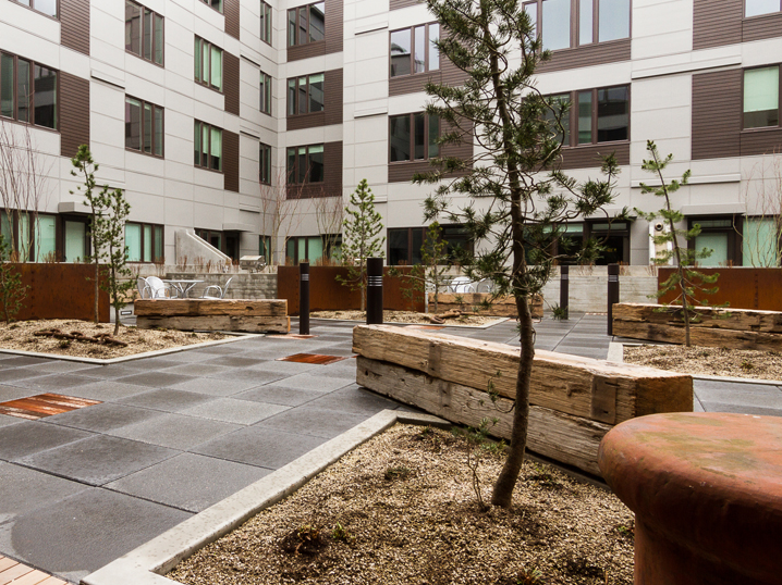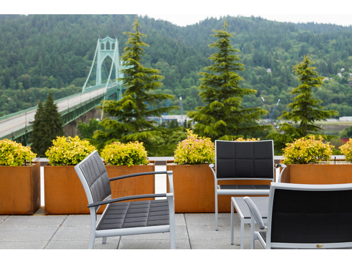 The courtyard is the first of its kind in the Portland area to include stormwater flow thru planters designed to filter and detain stormwater before reaching the City’s system. This project exemplifies responsible and sustainable design. The apartment building and courtyard amenities are constructed on top of basement parking garage. In addition, a small roof top terrace compliments the courtyard’s function and offers spectacular views of the St. Johns Bridge, the Willamette River, and the West Hills.