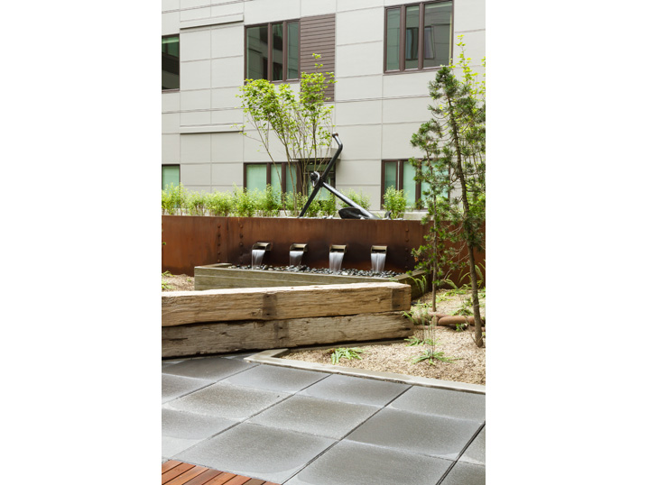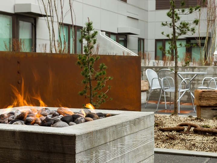 The design of the building and the central courtyard borrows a nautical theme from its portside industrial context near the Willamette River. The courtyard uses rusted metal sheeting to embrace the Willamette River’s industrial portage heritage, recalling a shoreline of wood docks, warehouses, ship freight and ship construction. Board formed concrete walls, salvaged wood dock piers, a ship anchor and sections of anchor chains create a unique courtyard décor for all residents to use. A water feature adds to the riverside ambiance as well as the stylish composition of seating niches, tables, chairs and barbecues that welcome daily use.