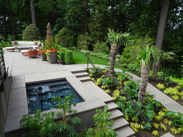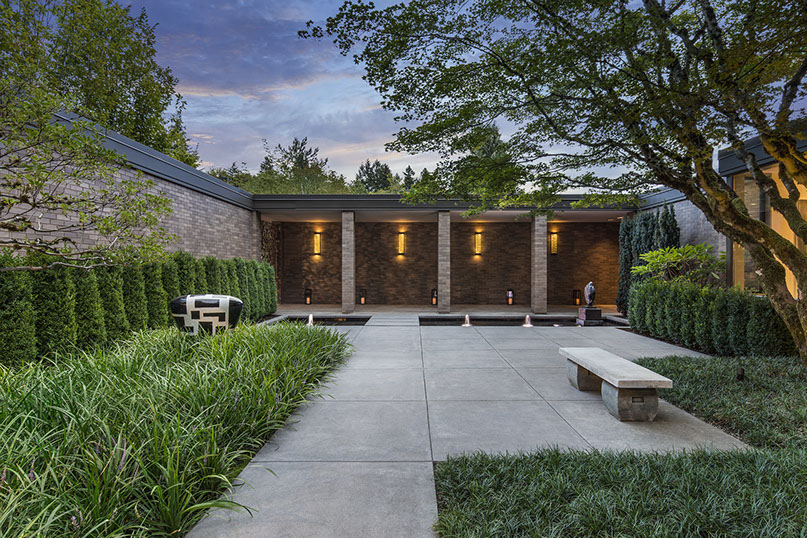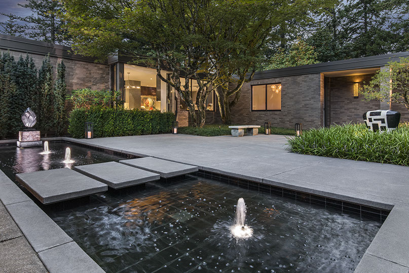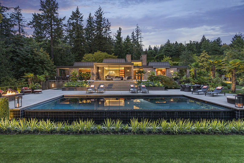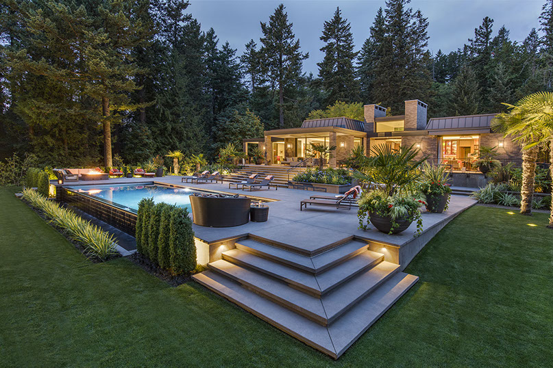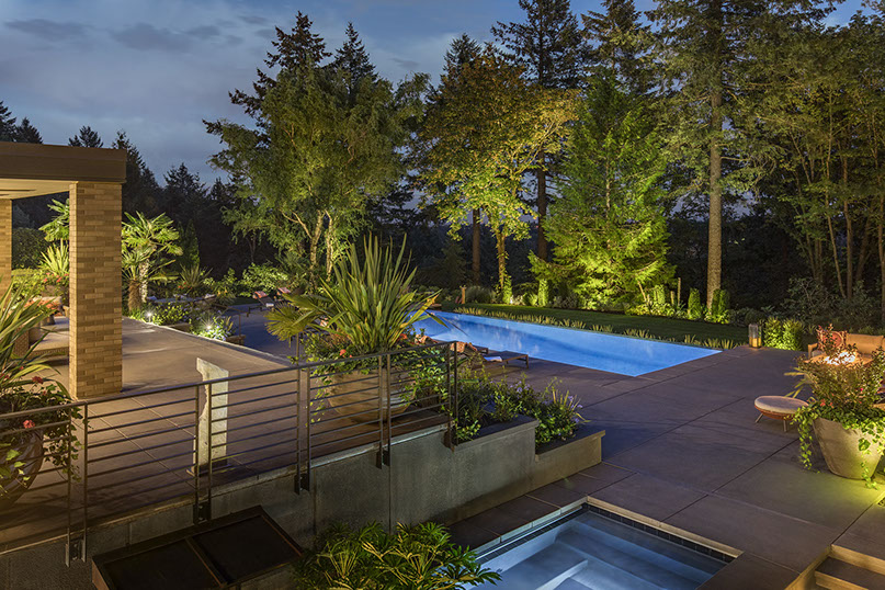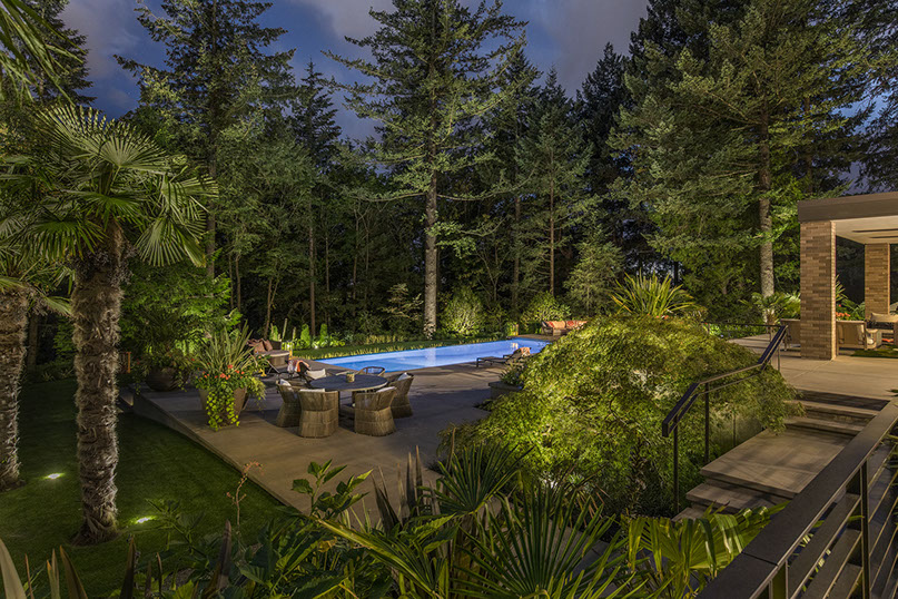Landscape features include a gardenesque hillside path and seating area, infinity edge pool, custom spa, acid-etched concrete retaining walls, custom fire pit, courtyard reflection pool, and finally a beautiful array of landscape lighting by Oregon Outdoor Lighting, highlighting a stunning palette of native and tropical plantings.