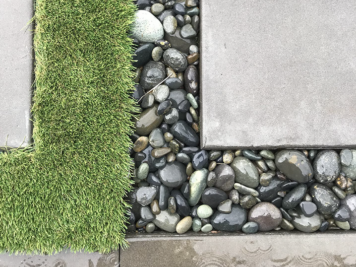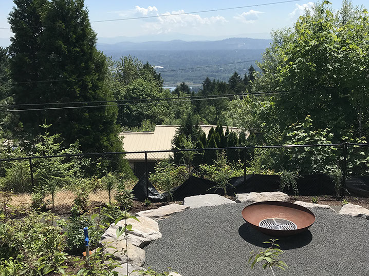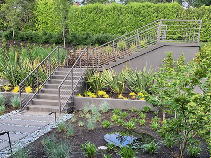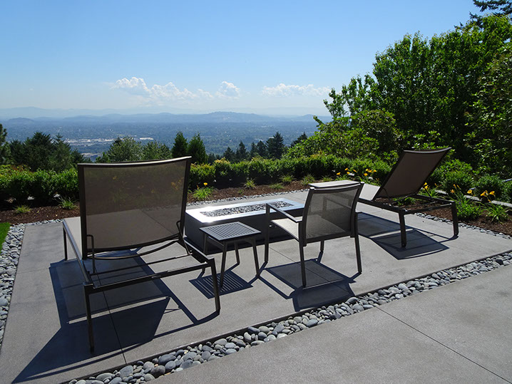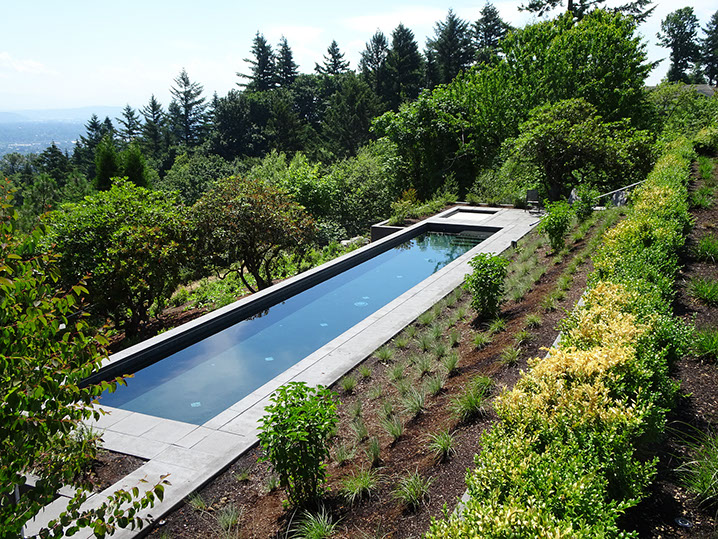 The landscape at the Panorama Residence falls dramatically from west to east, with grades dropping almost 70 feet from the property line at the street front to the back of the lot. Complementing the views of the landscape beyond are ornamental and native plantings which create sense of place and soften the edges created by new retaining walls as the site steps down slope. Landscape features include a custom swimming pool and spa, as well as two fire pits which emphasize the panoramic view of the Portland landscape.