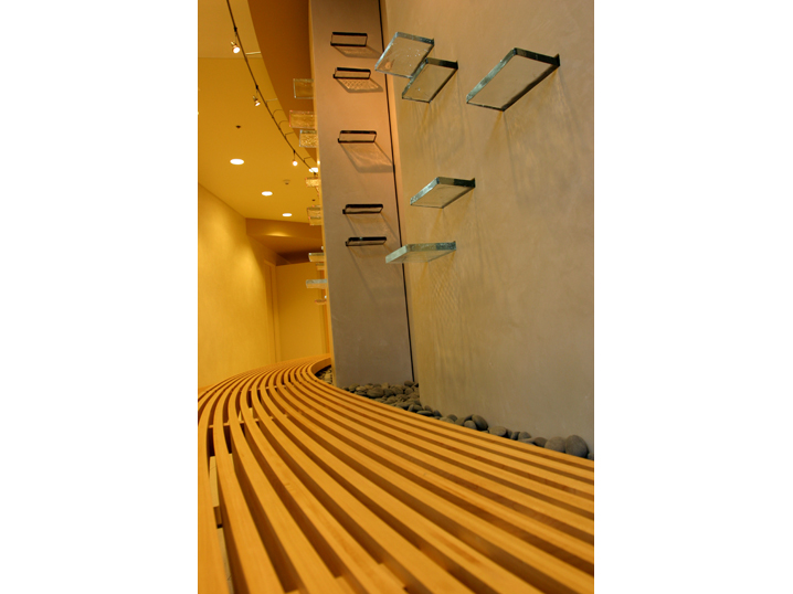 The custom Maple wood bench and the trough of river rock underscores the sense of movement as one enters the lobby space.