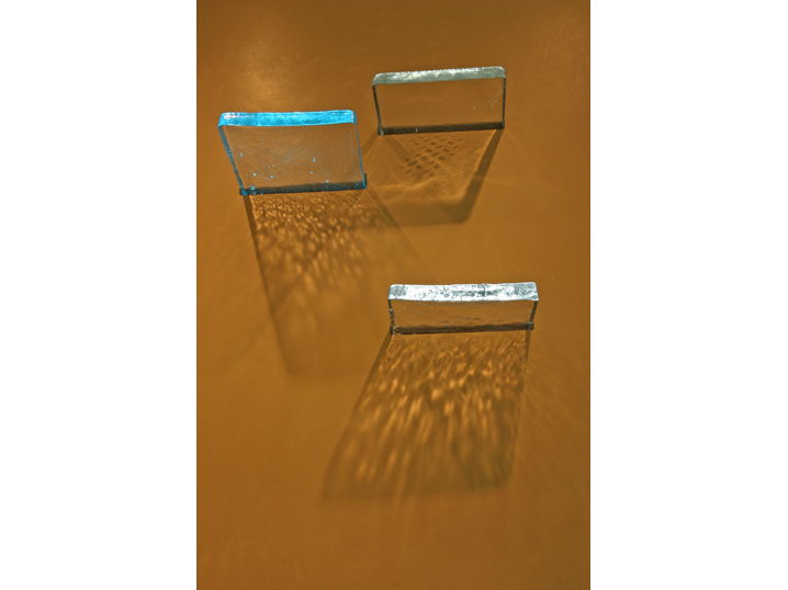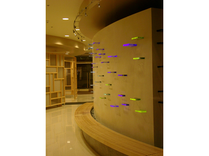 Modular glass tiles were inserted through the curved plaster surface and lit from behind by color changing fiber optics. Placement of the tiles was choreographed by KLA with each glass tile extending out of the wall at a different degree. This enhances the sense of motion created by the tiles changing of color and sparkle.