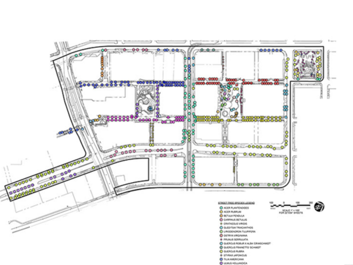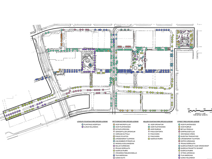 Renewed interest in the district has led to many questions about South Auditorium Plan District, the original vision and design intent. The ensuing development and apparent impacts to the maturing landscape raises specific questions about how the planting design supports the original vision. Answers to these questions depend on a clear definition of the design intent of the planting design for the parks and pedestrian malls. The trees in the district are reaching maturity uniformly and in need of additional care in the form of wholesale renovation and complete restoration. The unintended overcrowding of trees, deferred maintenance and evolving changes to micro climatic conditions such as sun exposure, depleted soil quality and non-functioning irrigation are some of the issues accelerating decline.