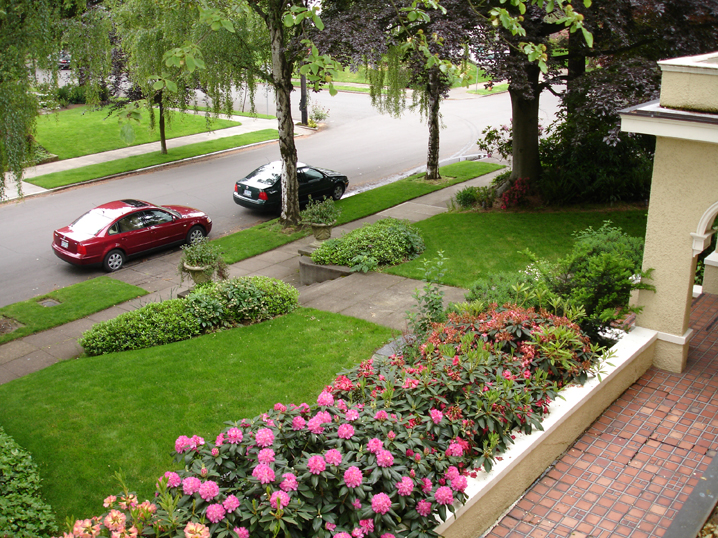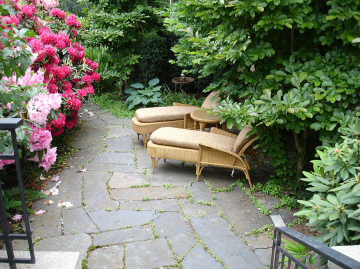 formal visual axis that extends off the terrace into the more gardenesque landscape. A shade garden with native plantings and flowering magnolias was introduced for contrast to the formality of the terrace and as a private retreat for the owners.
