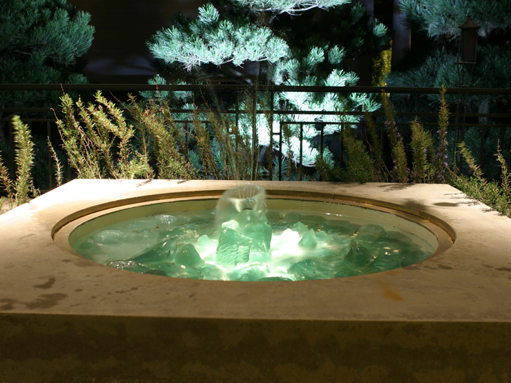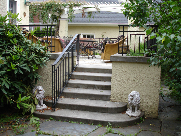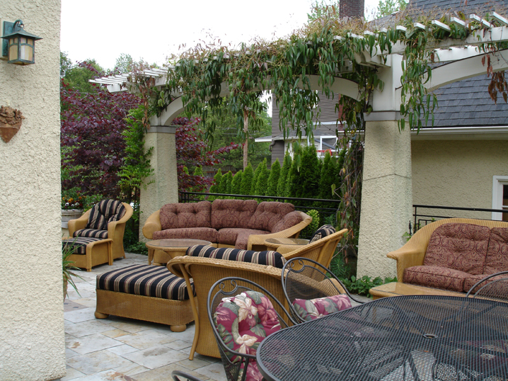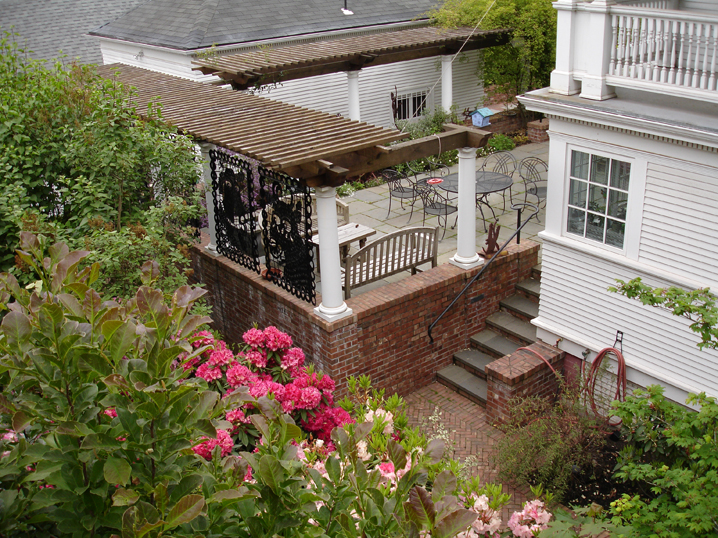 exemplifies sensitive design responses to the eclectic style of the home. Borrowing form from the architectural detail of the house, arching pergola beams and stucco columns enclose a terrace for entertaining. An elegant fountain feature is the focus of a