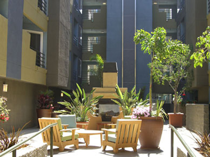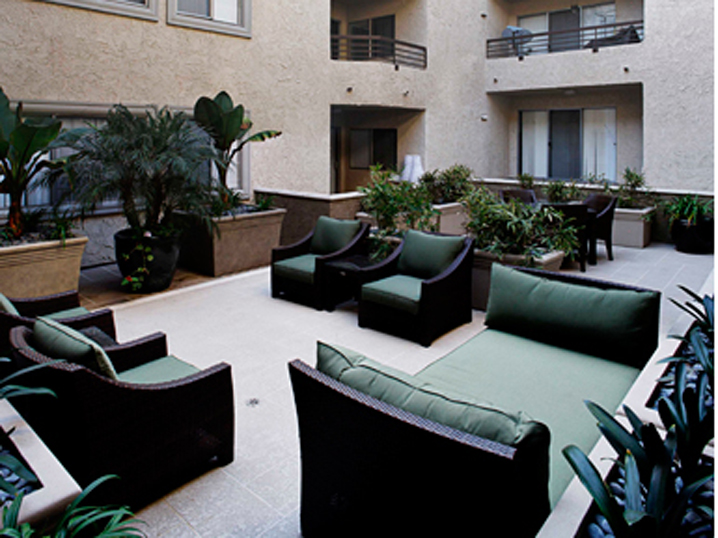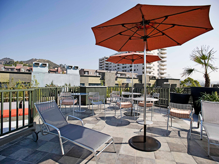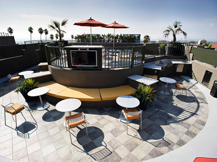 At the Vantage Apartments in Hollywood CA., KLA re-created a roof top entertainment center complete with large screen TVs, seating, plantings and a BBQ kitchenette.