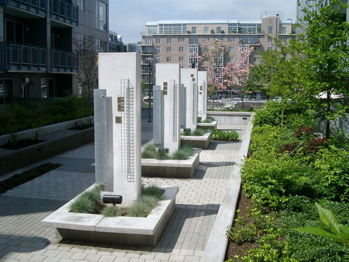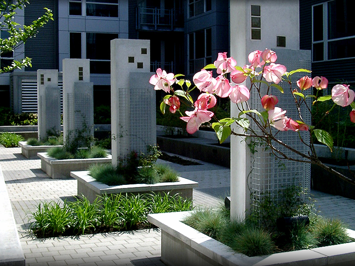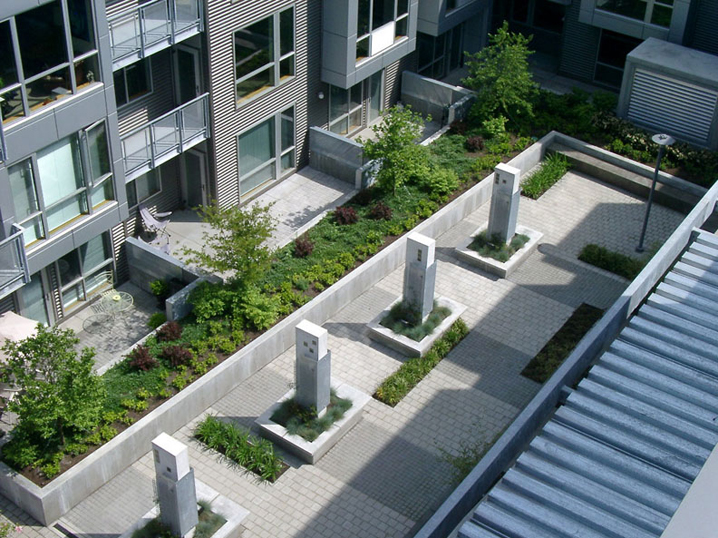 The Lexis condominium’s private second floor courtyard overlooks Tanner Springs Park and the new Fields Park in Portland’s Pearl District.