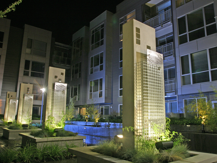 The courtyard features contemporary landscape elements and a sophisticated plant palette that provides clarity and formality to the space. KLA designed sculptural columns that are indirect light features constructed with brilliant white precast concrete clad with perforated galvanized steel and mesh. These columns double as trellises that seasonally become living green partitions between quiet seating areas. The unique light columns are literally the highlights of this project.