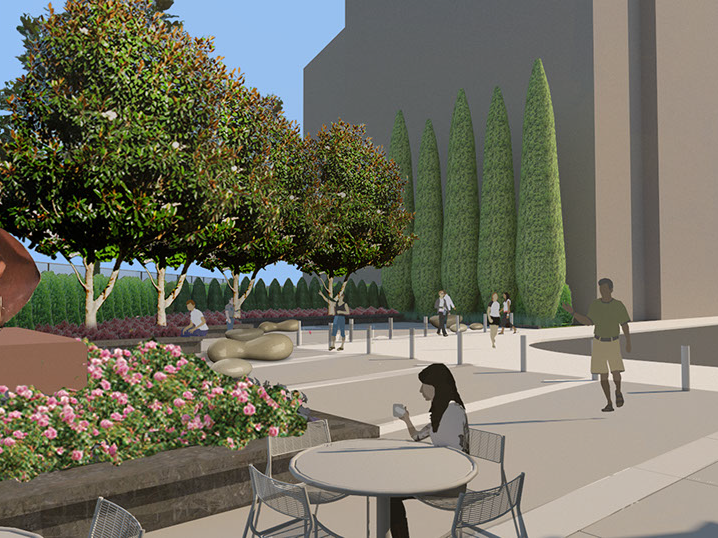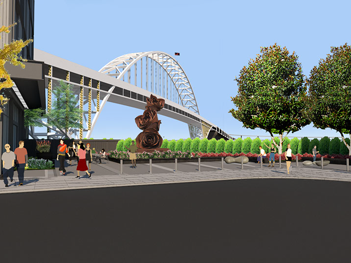 Early concepts included a round-about, centered with a sculptural monument alluding to the ecology of the river district of Portland; more recently, KLA has focused on activating the space on the southeast corner of the site with custom illuminated benches and the addition of food trucks.